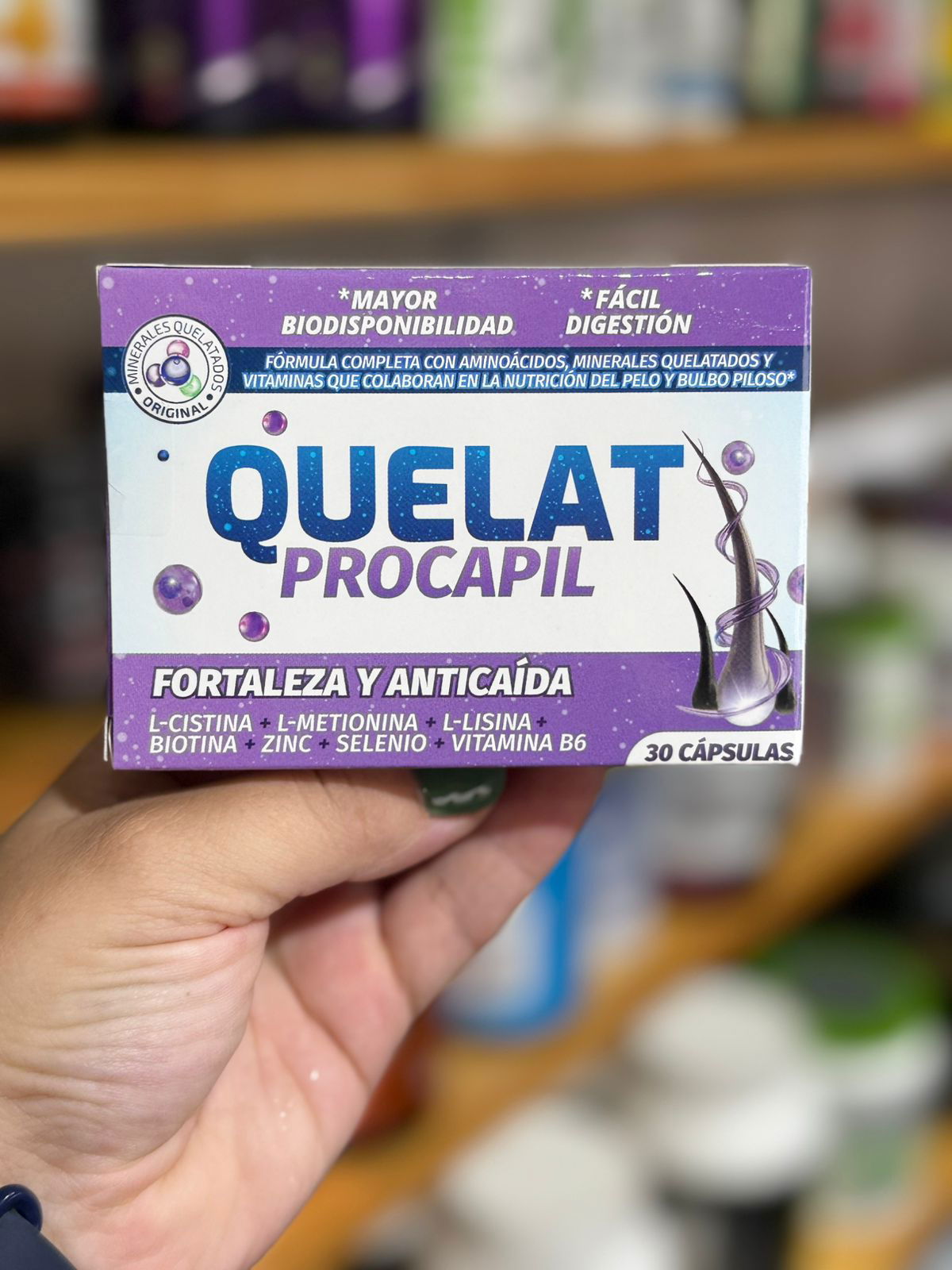 Quelat® Procapil presenta la última innovación para la fortaleza y anticaída del cabello. Compuesto con los aminoácidos indispensables para la síntesis de la queratina. Especialmente indicado en la fragilidad del tallo piloso y de las uñas y combinado con los minerales quelatados esenciales para el crecimiento y protección del capilar. La fórmula de Quelat® Procapil combina L-cistina, metionina, lisina, biotina zinc selenio y vitamina B6, potenciando los beneficios de cada uno de estos nutrientes con funciones en la salud capilar, proporcionando los mejores resultados anticaidas del cabello.