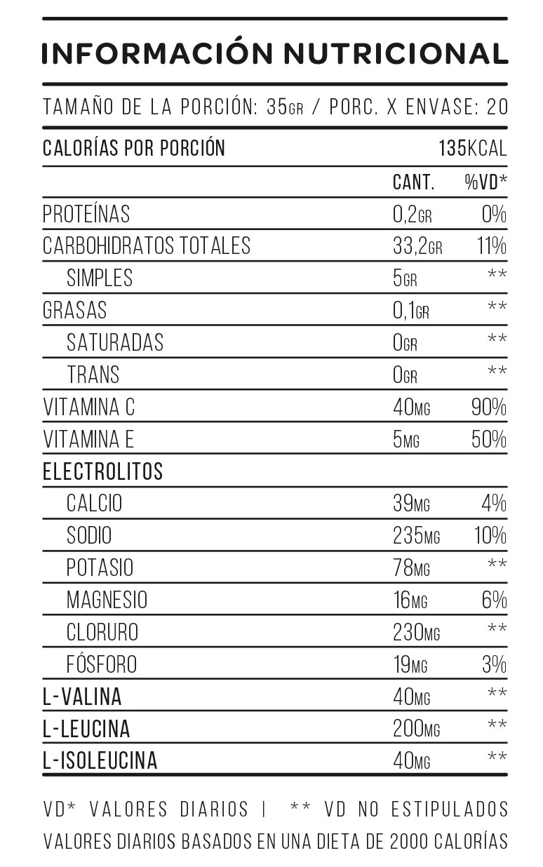 (Maltodextrina, Cerelosa y Fructosa) Ácido Cítrico, Cloruro de Sodio, Citrato de Sodio, L-Leucina, Lecitina de Soja, Citrato de Potasio, Citrato de Magnesio, Fosfato de Calcio, Cloruro de Potasio, Ácido Ascórbico, L-Valina, L-Isoleucina, Tocoferol Acetato, ARO Sabor según corresponda y colorante.