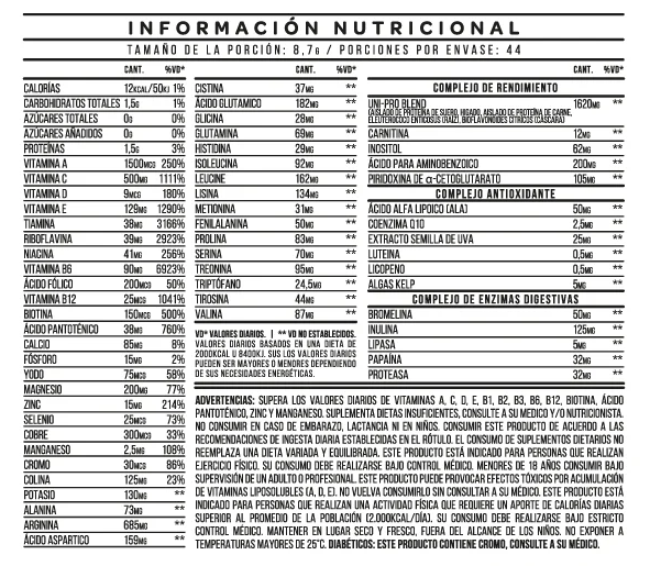 VITAMINAS Y MINERALES ESENCIALES PARA EL APOYO NUTRICIONAL E INMUNOLOGICO DIARIO Valores nutricionales optimizados para satisfacer las necesidades diarias de vitaminas, minerales y hierbas de los atletas, incluidos zinc, vitaminas C, B, D, además de aminoácidos EAA y BCAA, y más.
